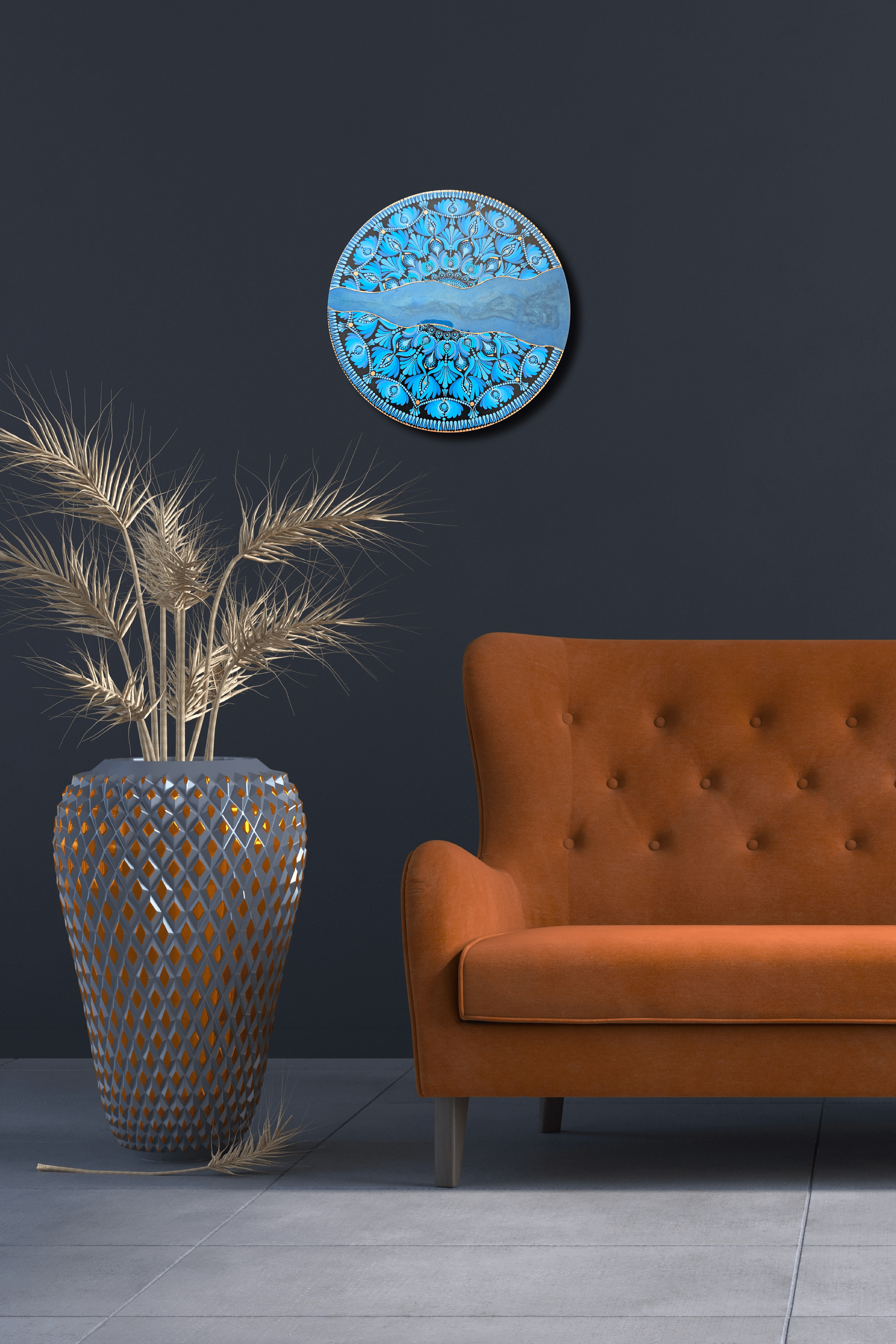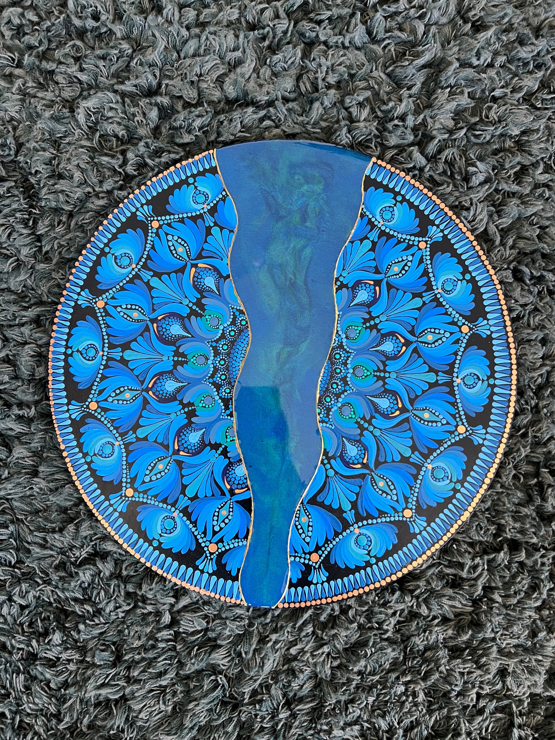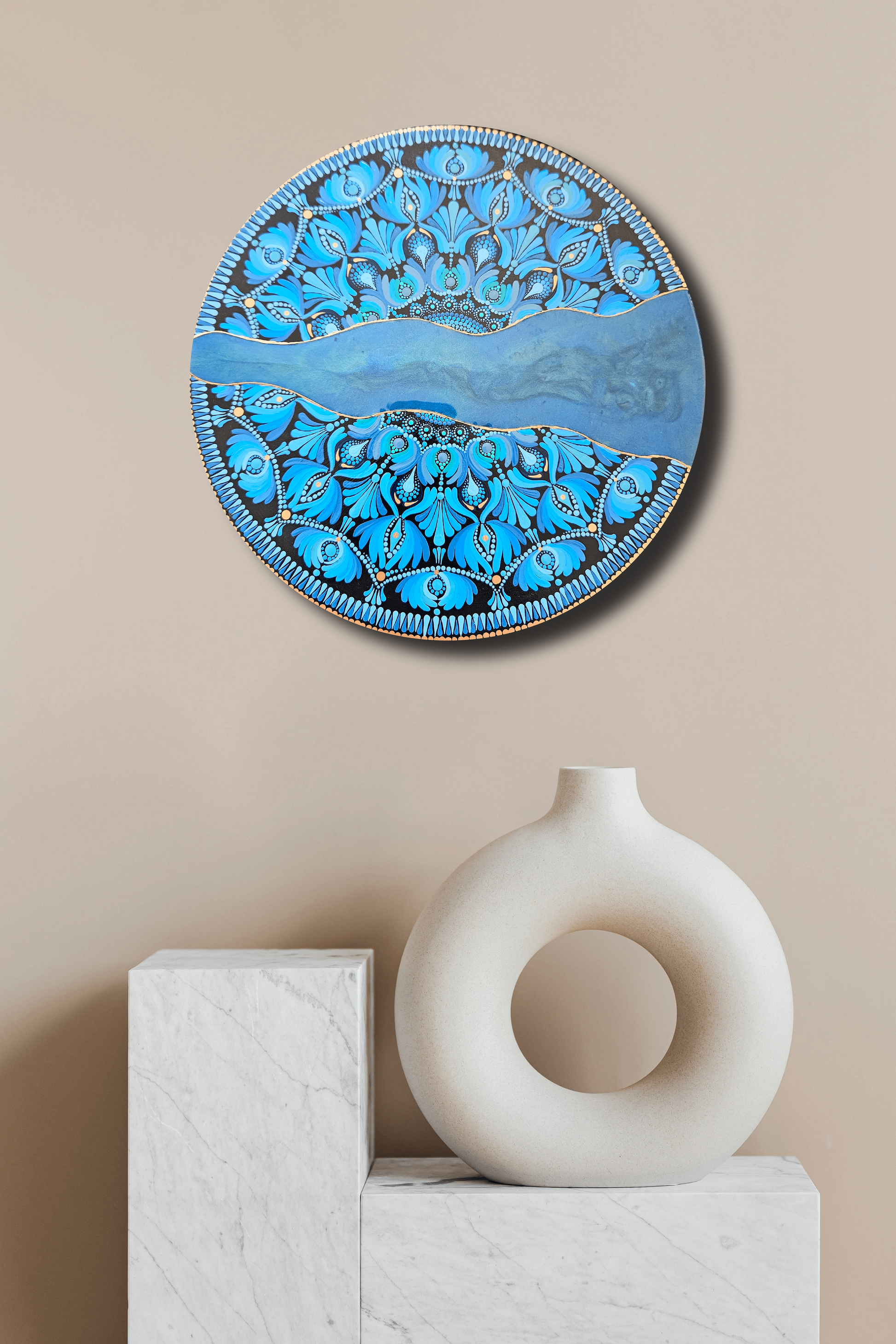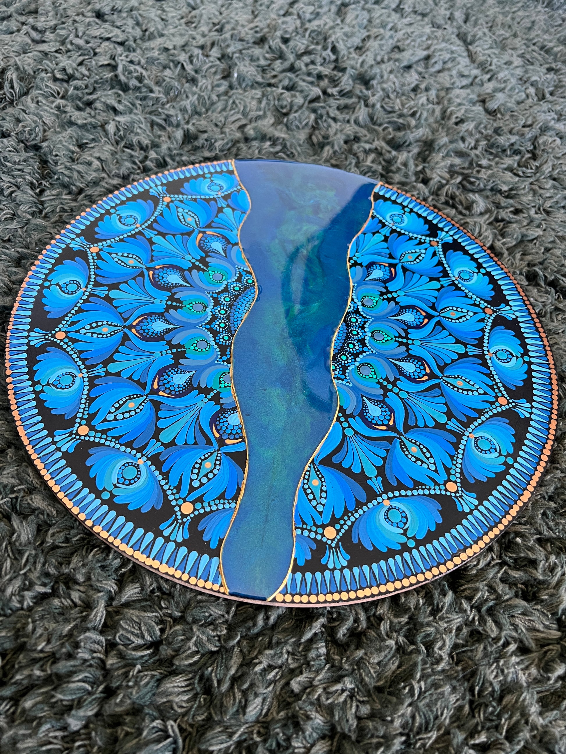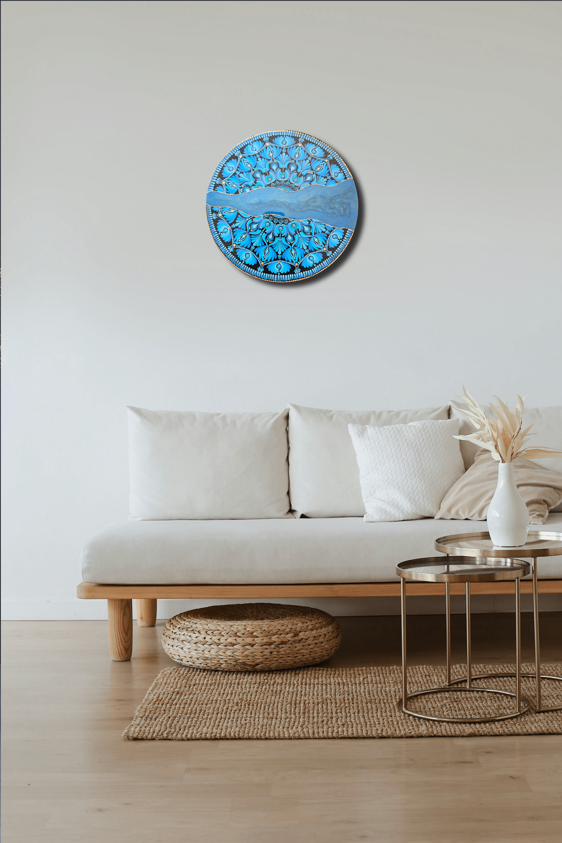 Bring the gentle flow of the river into your home with our blue-shaded dot mandala, themed around the peaceful beauty of rivers. Enhanced with metallic resin to mimic the shimmering flow, this mandala adds a river-like calmness to your decor.