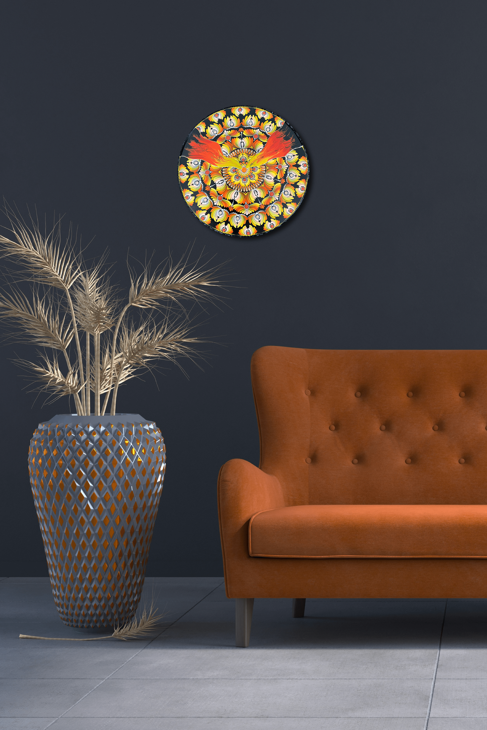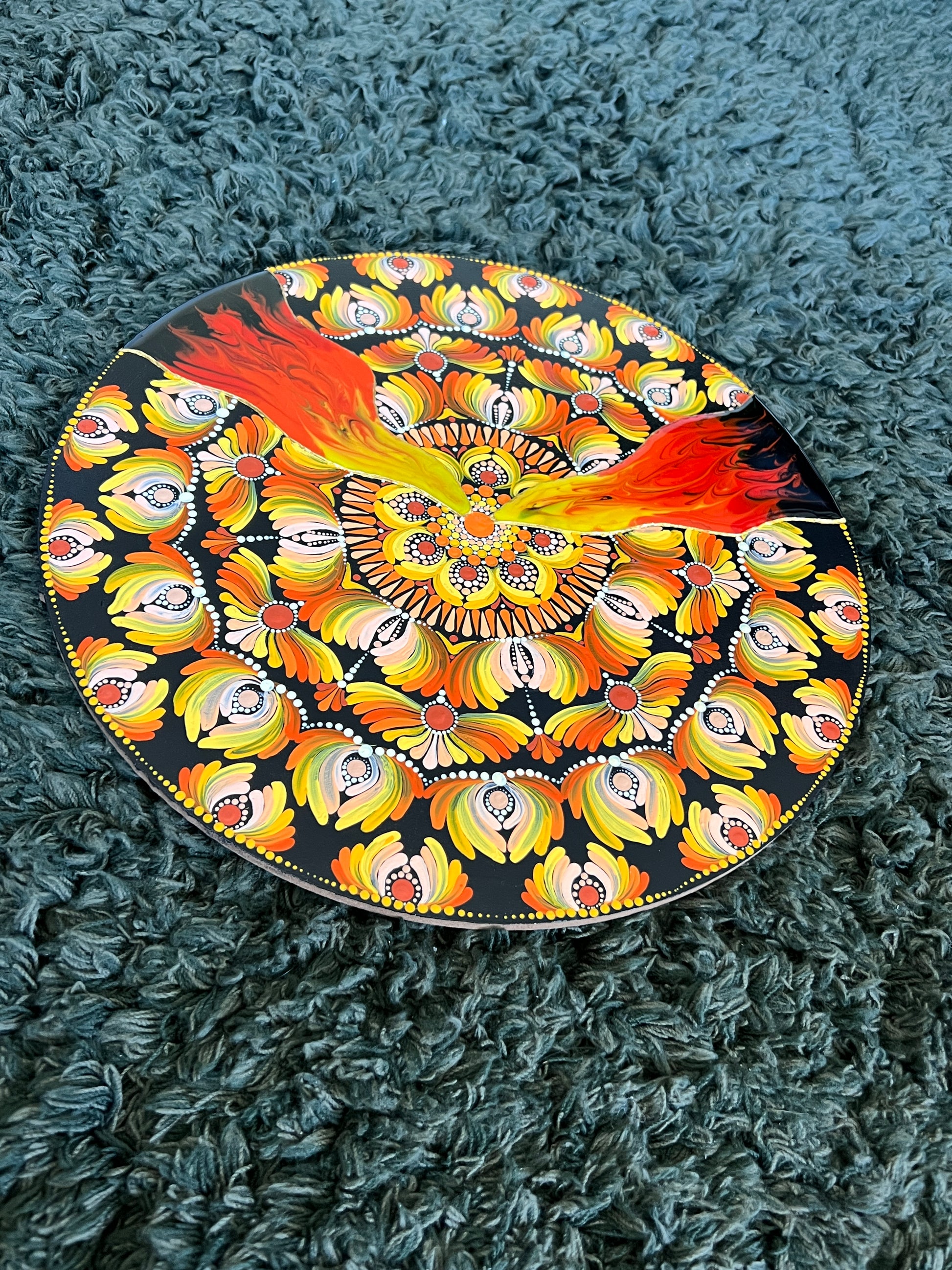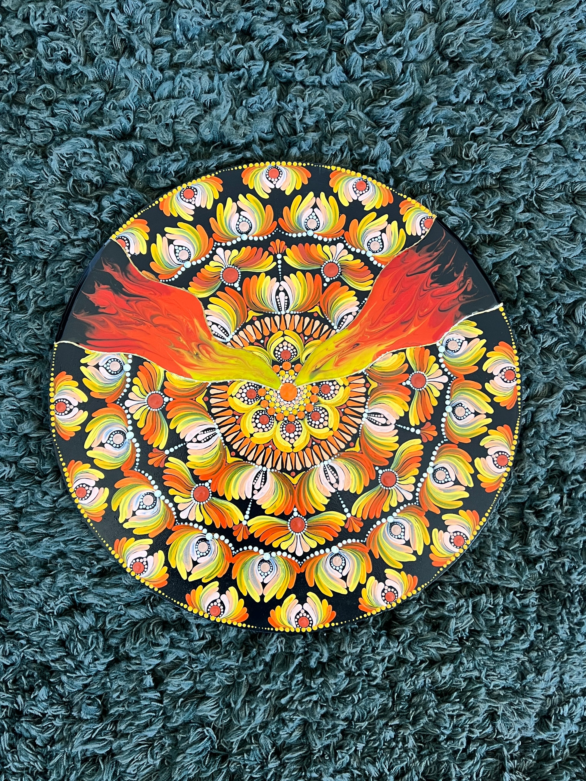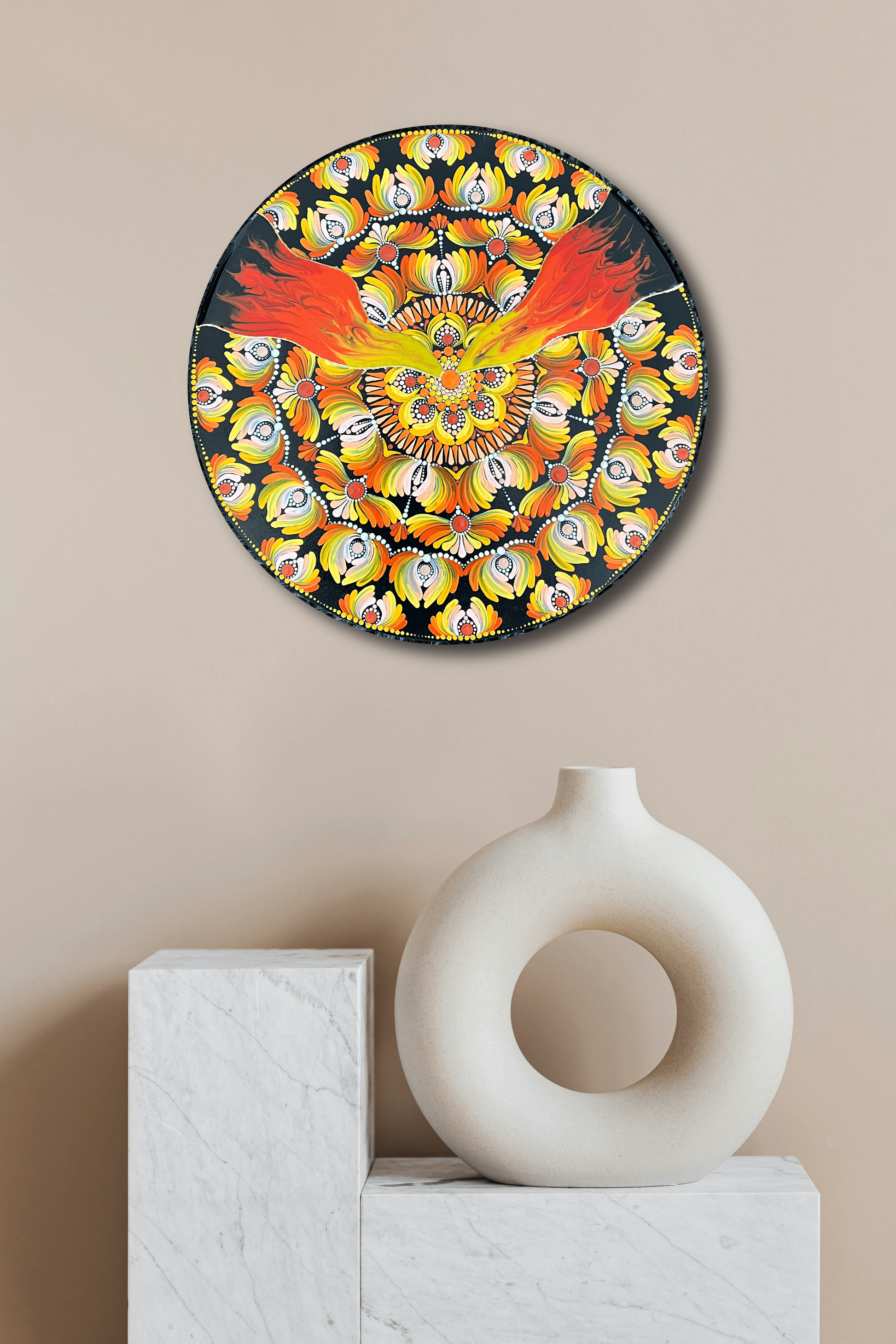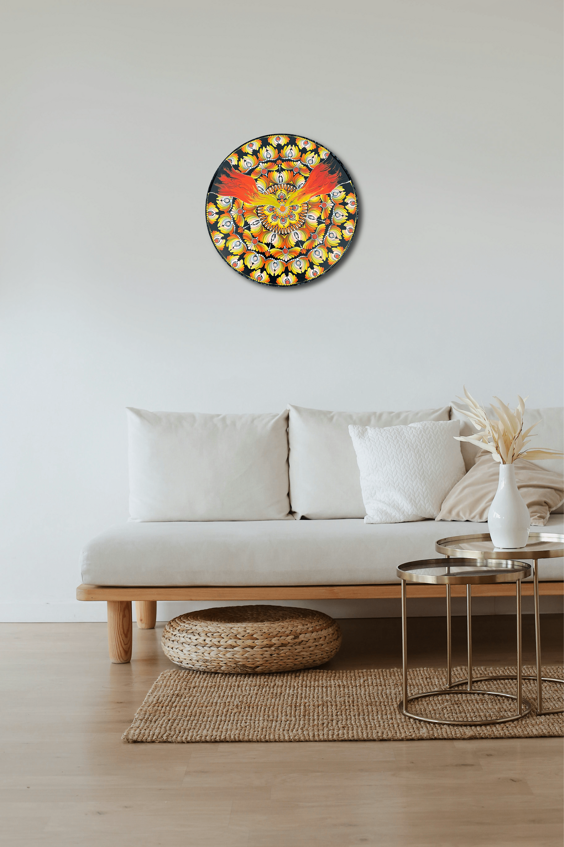 Bring the warmth of fire with our dot mandala, painted in vivid yellows and oranges. Enhanced with a lava-like feel made of resin, it symbolizes energy and creativity. It's a vibrant addition to any space, sparking passion and renewal in your decor.