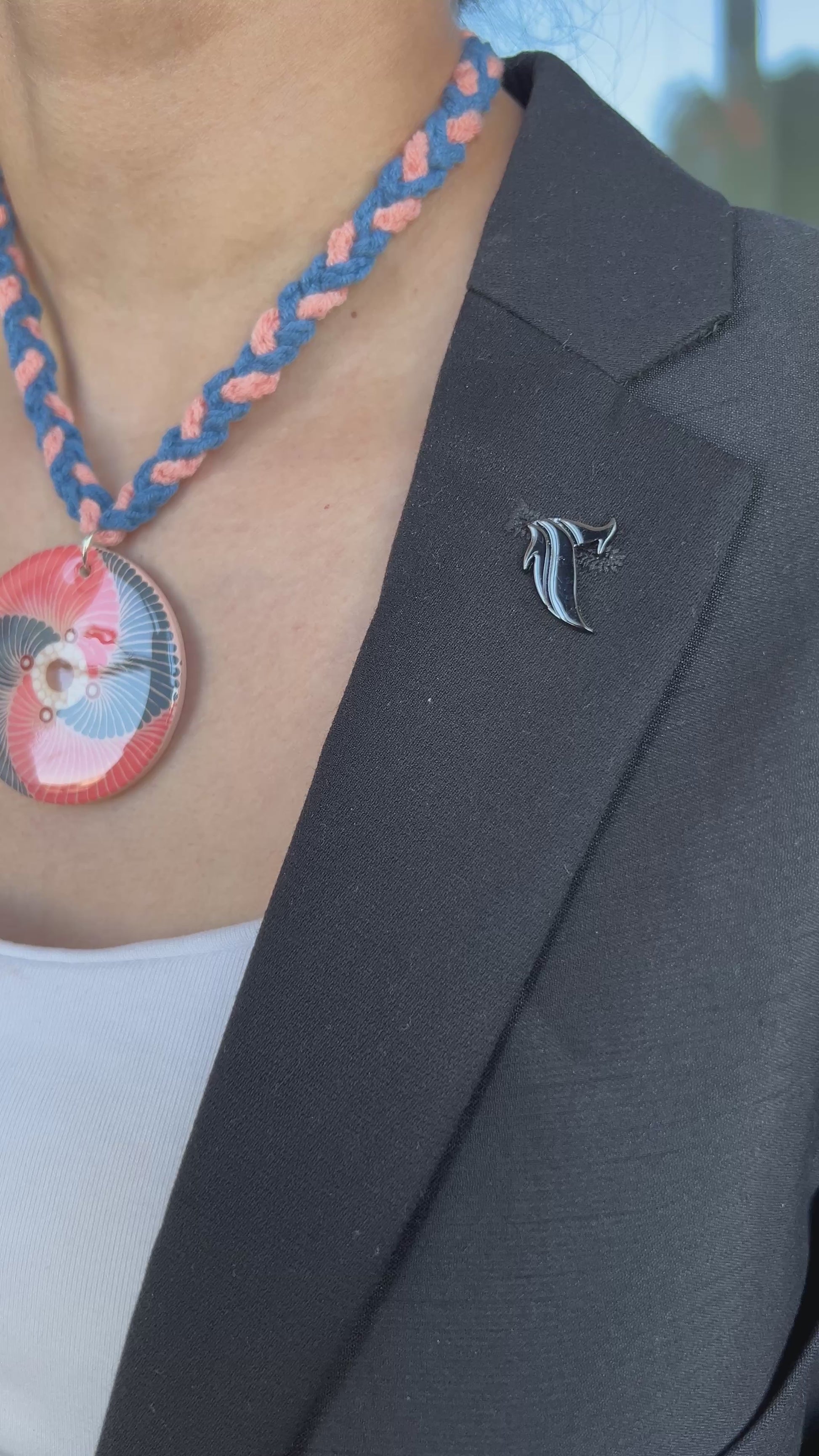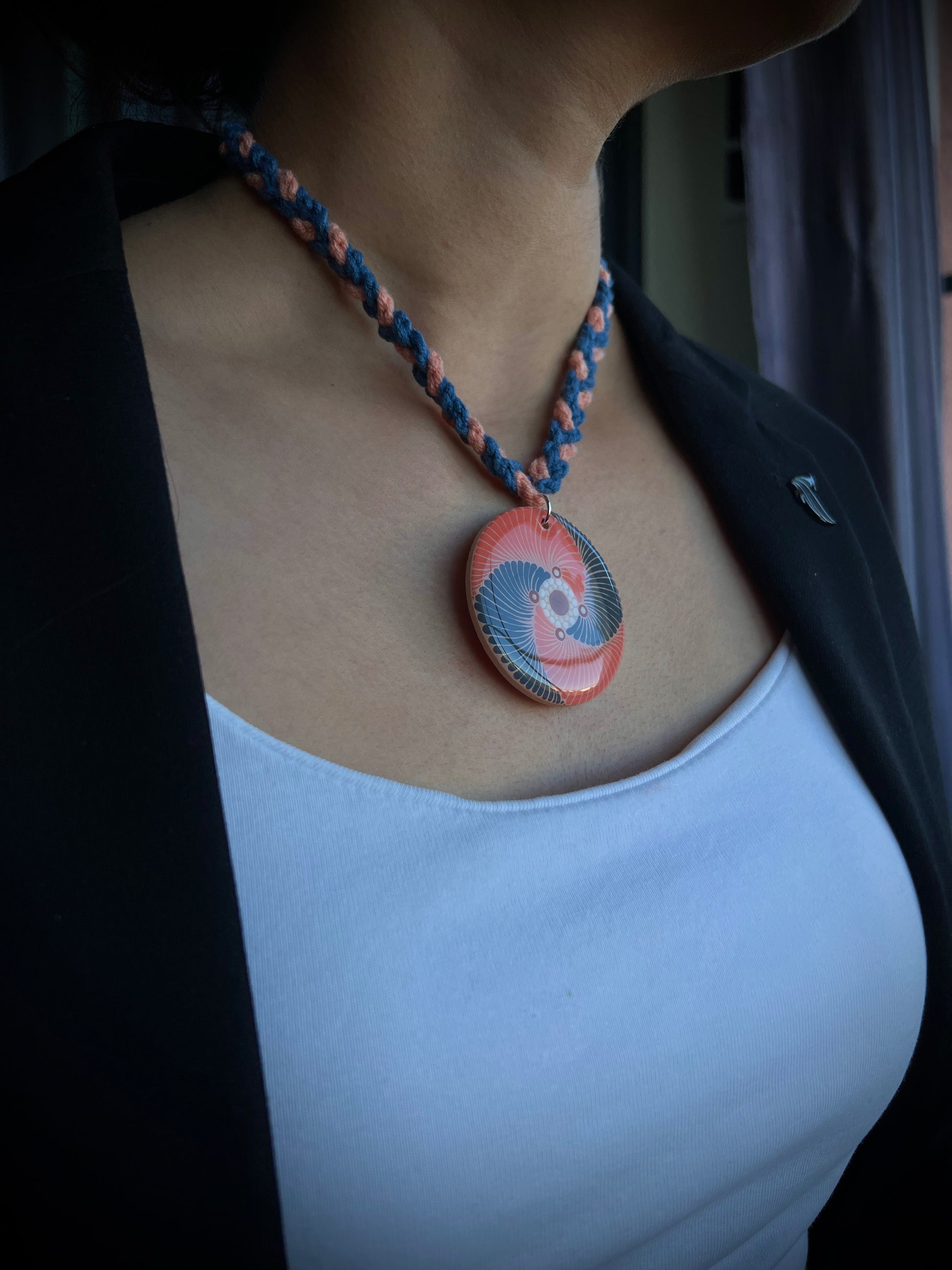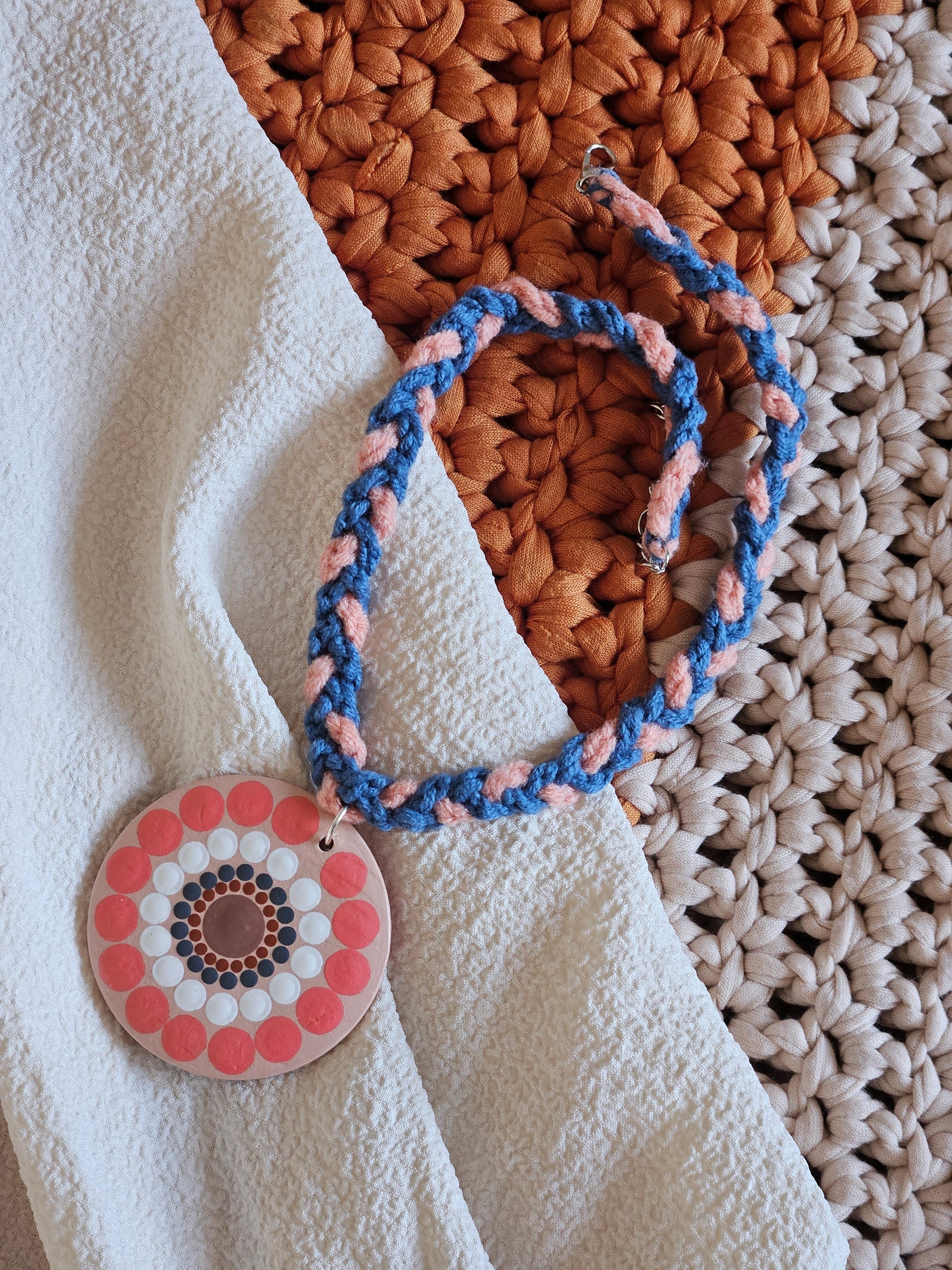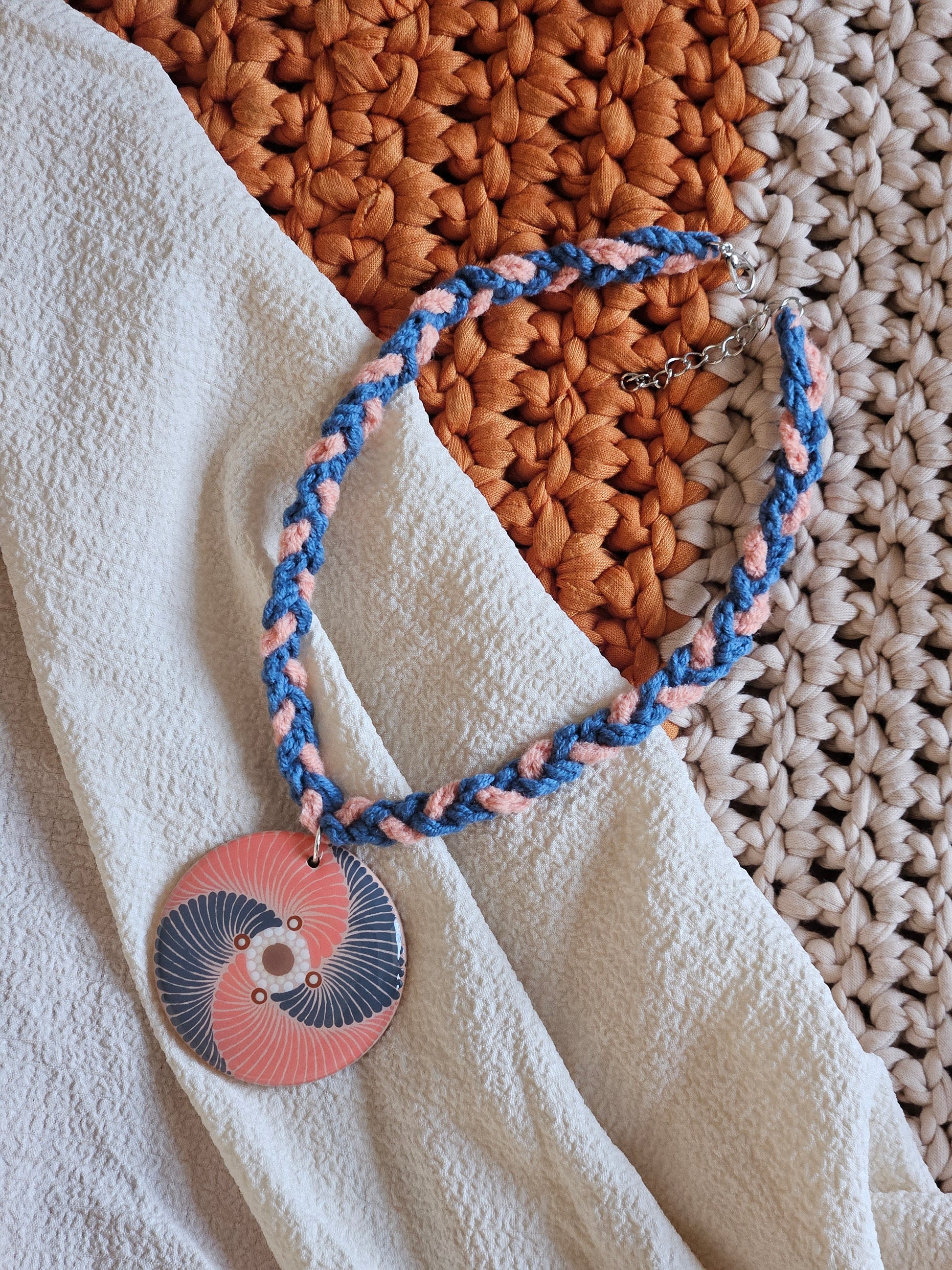 Hand-painted Dot Mandala Pendant in Peach and Blue color paired with a crochet necklace, Resin Coated Boho Jewelry, birthday Gift For Her