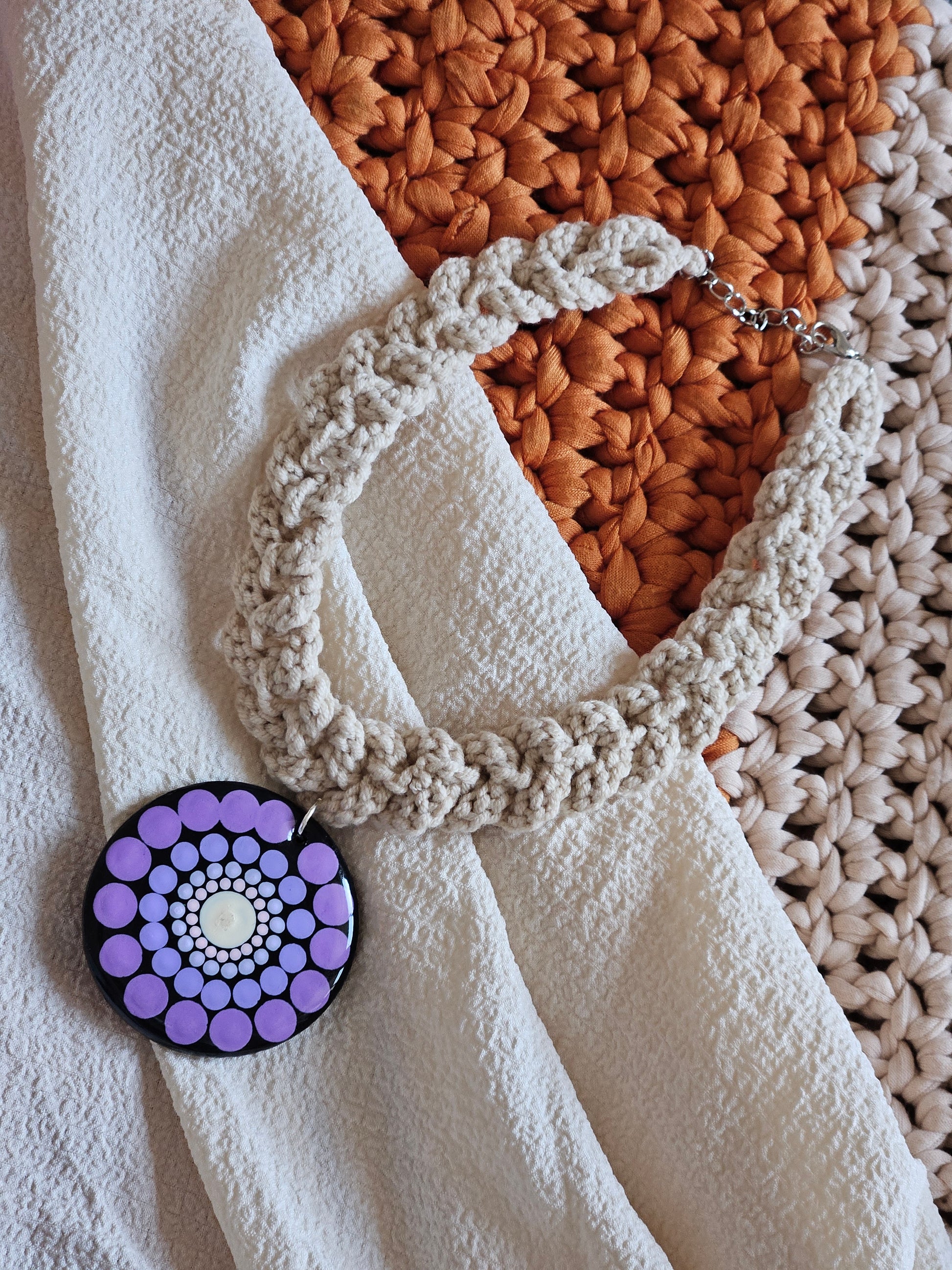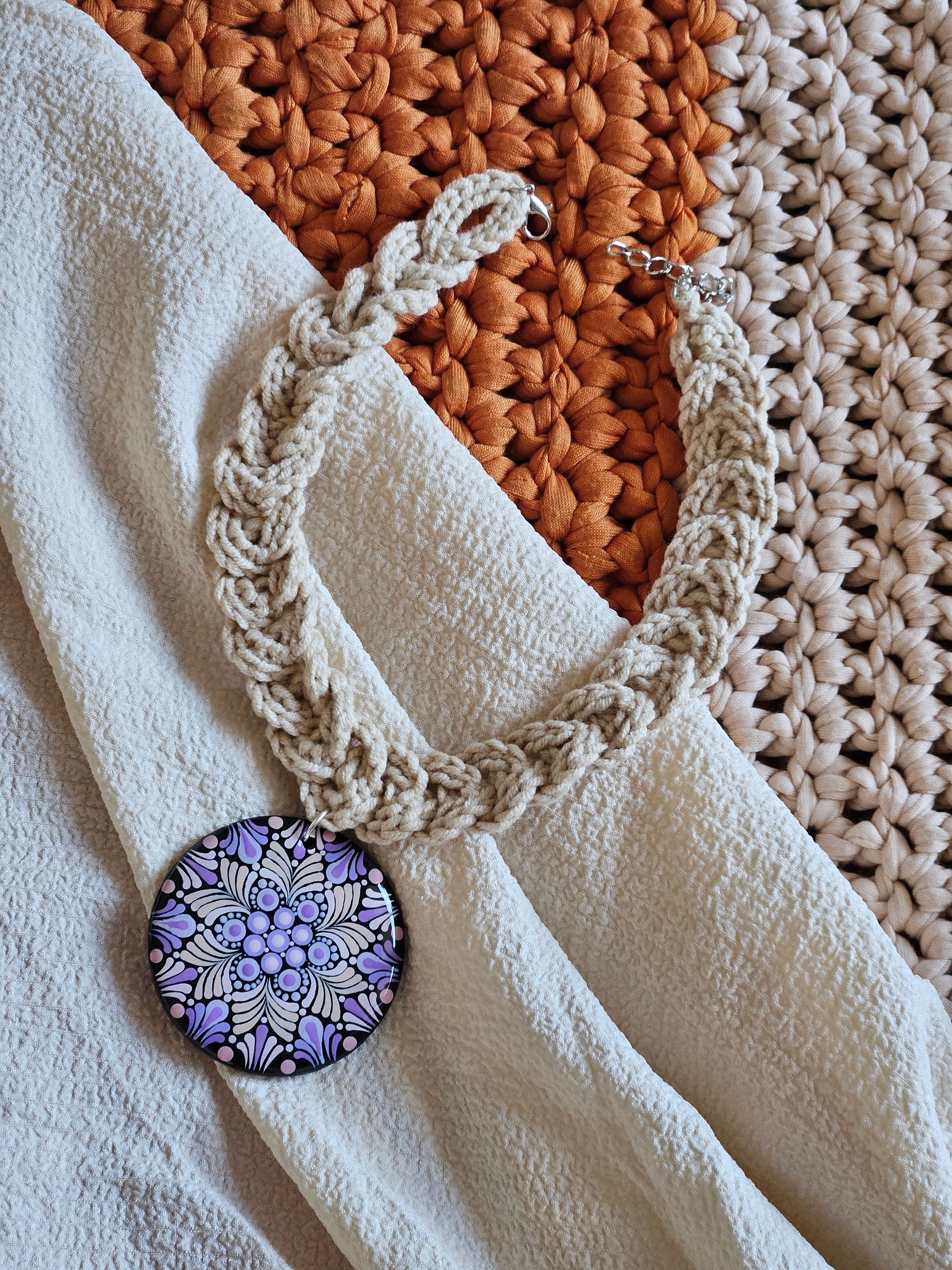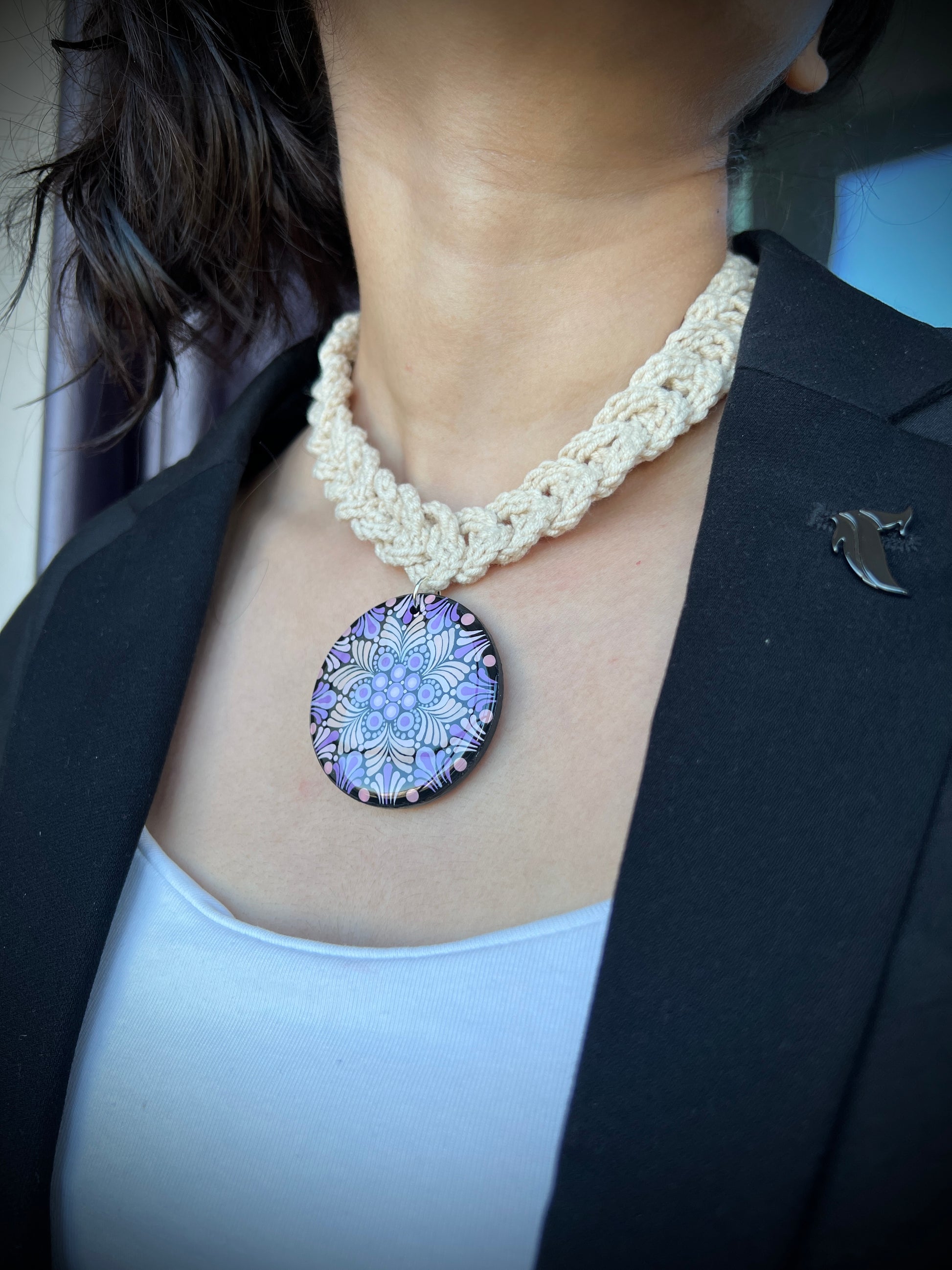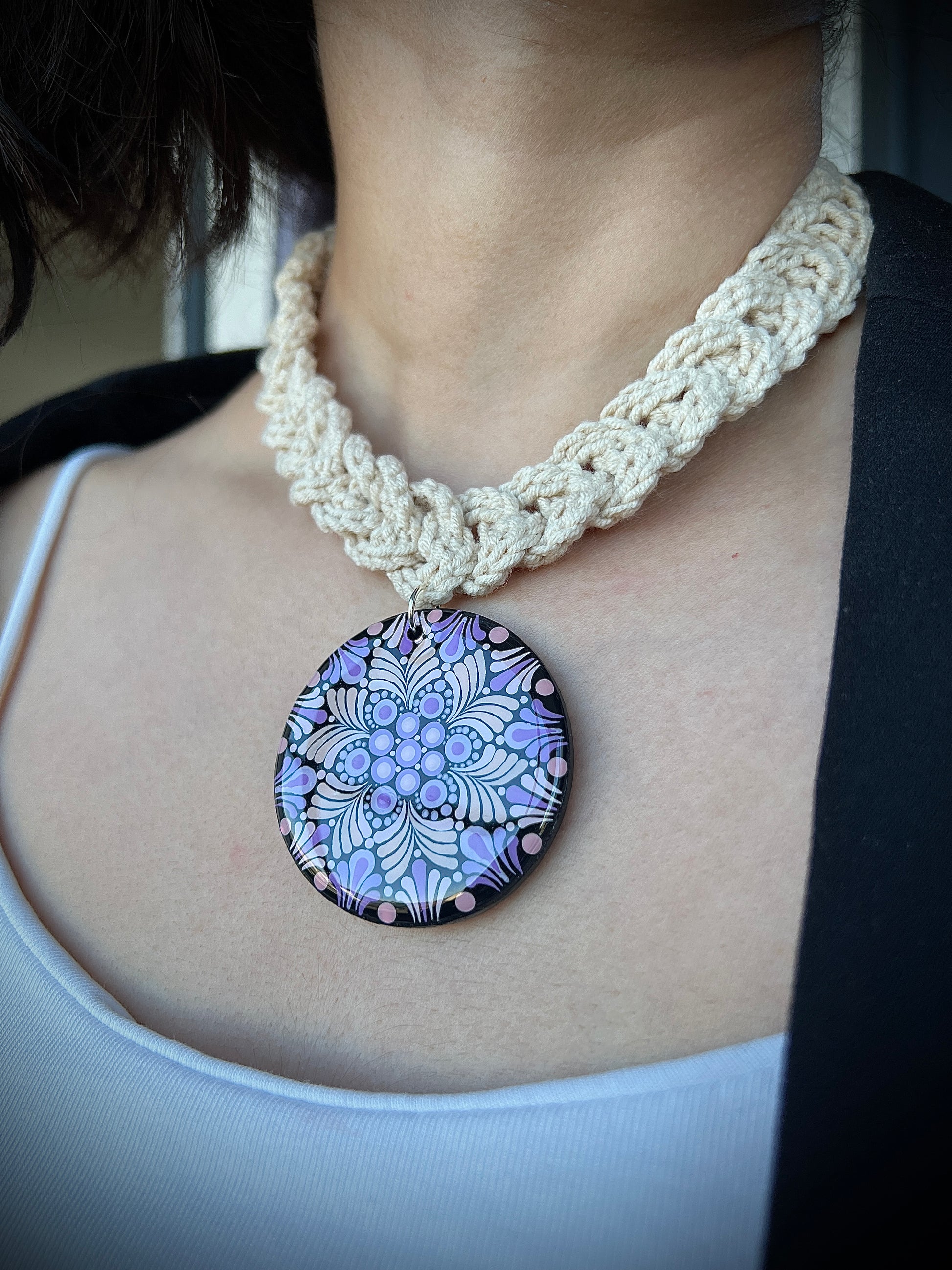 Hand-painted Dot Mandala Pendant in lavender, White color paired with a crochet necklace, Resin Coated Boho Jewelry, birthday Gift For Her