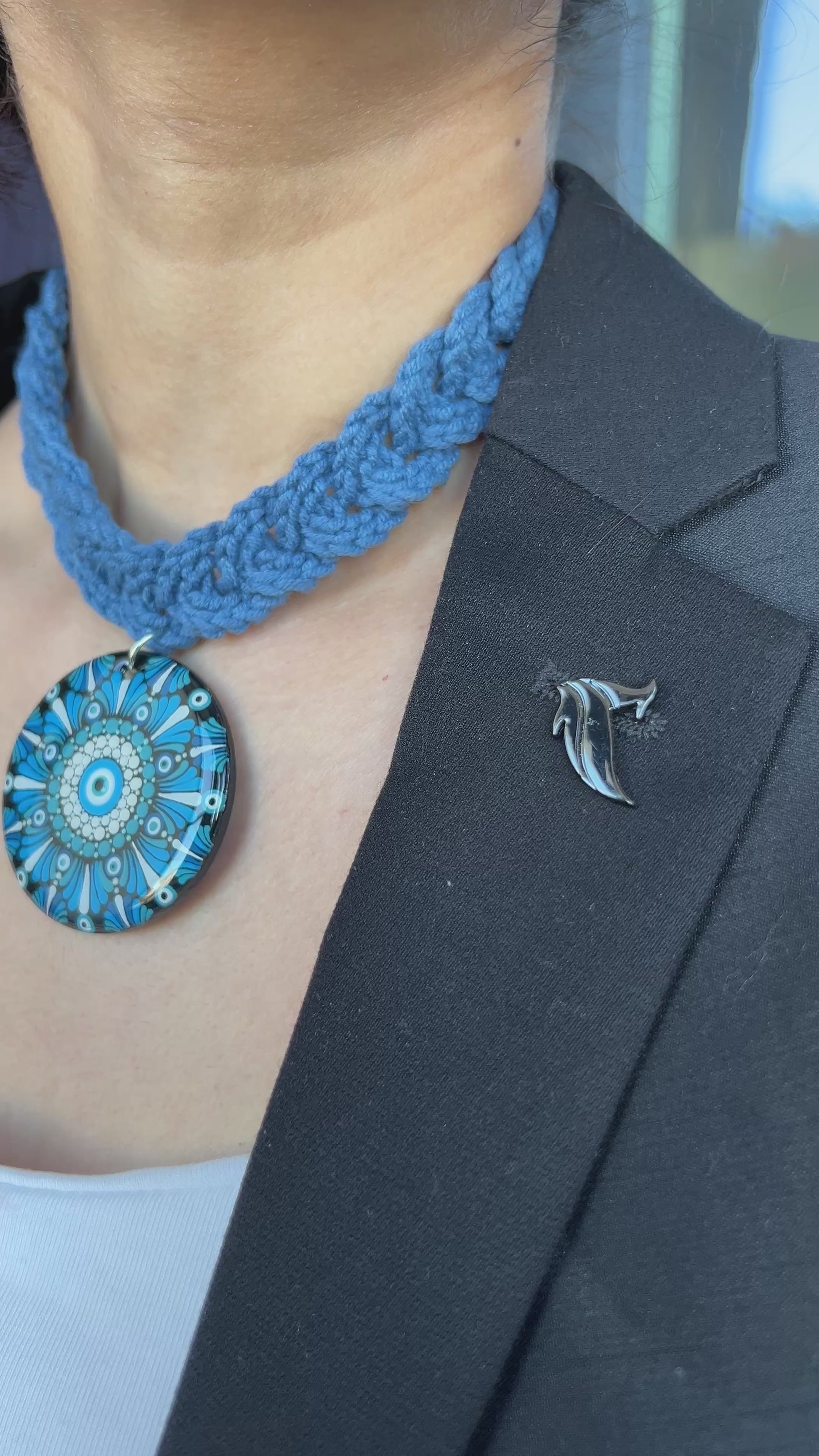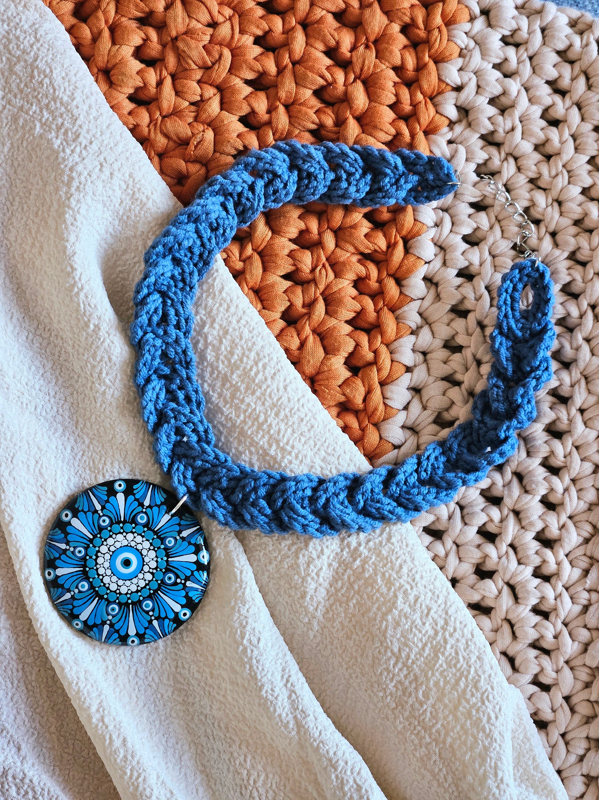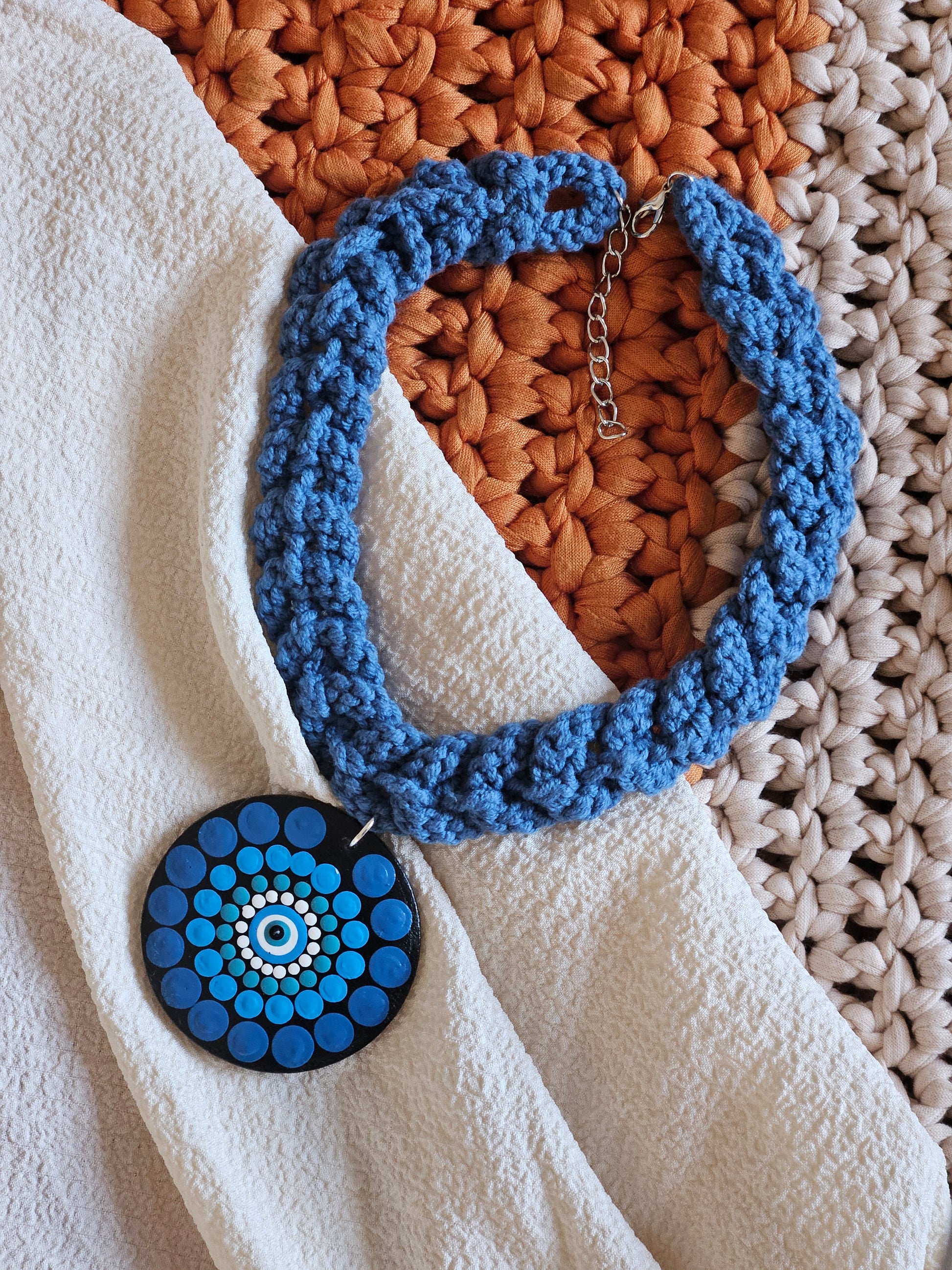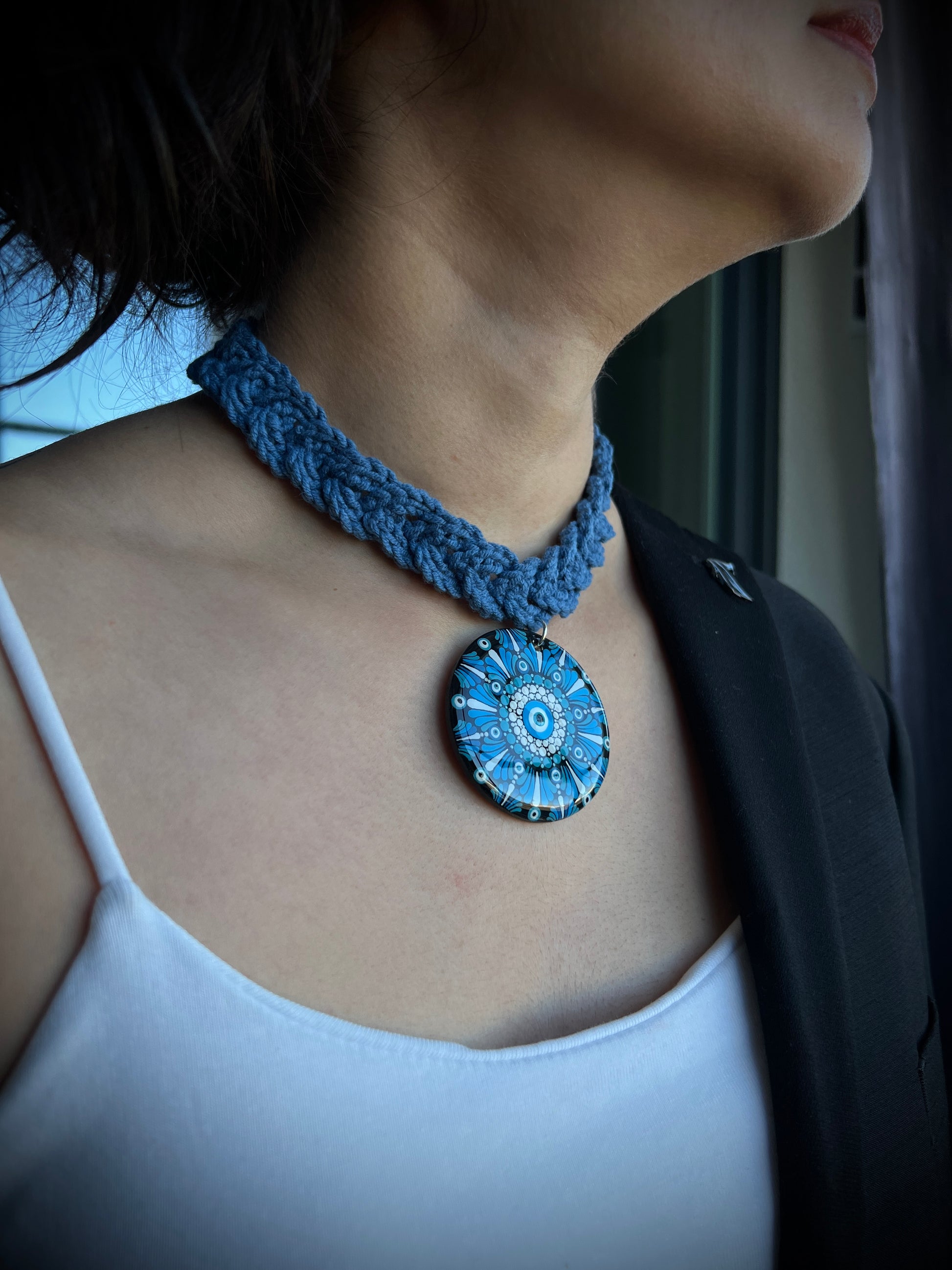 Hand-painted evil eye Dot Mandala Pendant paired with a crochet necklace, Resin Coated Boho Jewelry, anniversary and birthday Gift For Her